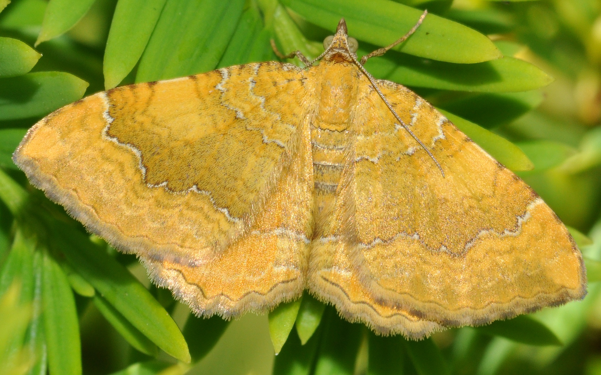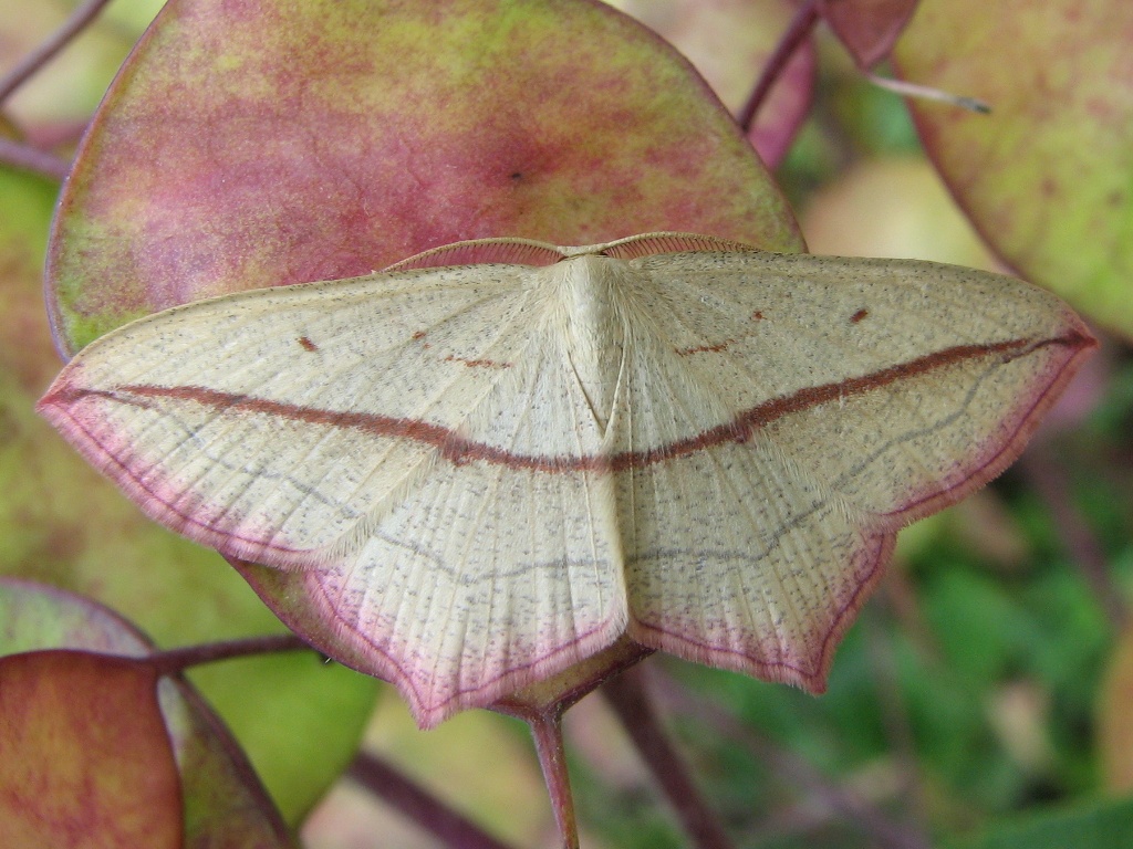 Blood Vein moth (Timandra comae). This one took a bit of chasing to photograph - as you may have read on our "down the garden" page, I disturbed it among the herbs from where it flew onto the greenhouse. Before I could photograph it there, it flew back to a rosemary bush where I got a couple of shots. It then moved again, and landed on the developing seedpods of an honesty plant where I took this photo. The match between the colours on the moth and the plant made the image particularly attractive. Follow links for