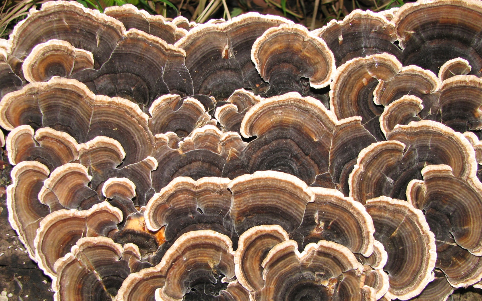 Trametes versicolor, the Turkey tail fungus, or many-zoned polypore is very common. This growth appeared on an old piece of ash which had been felled and cut into logs and blocks for firewood some years previously. The flat surface of the wood resulted in this beautifully patterned growth.