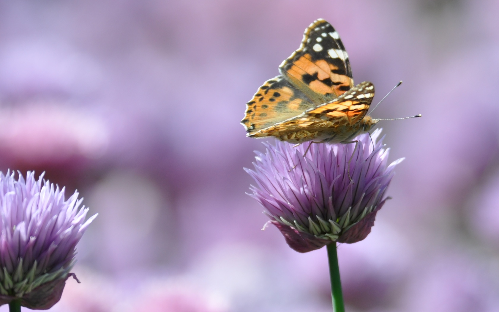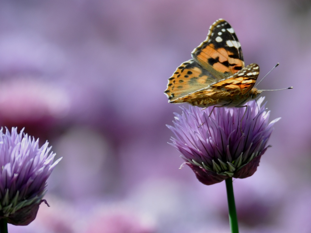 painted lady butterfly (Vanessa cardui) was one of about twenty which landed on the flowers on our chives in May 2009. An unusually large migration had resulted from good rains in North Africa over the previous months. Click on the image to the left, or