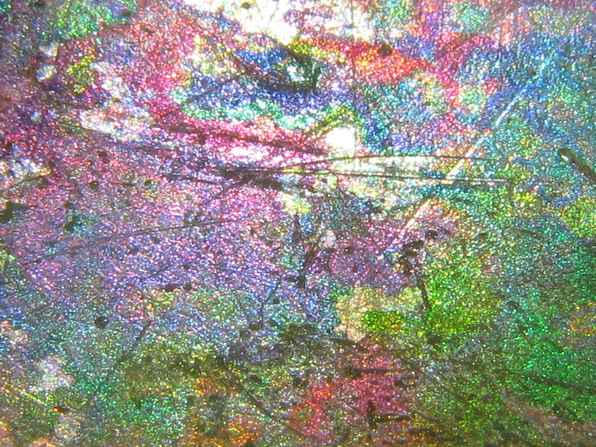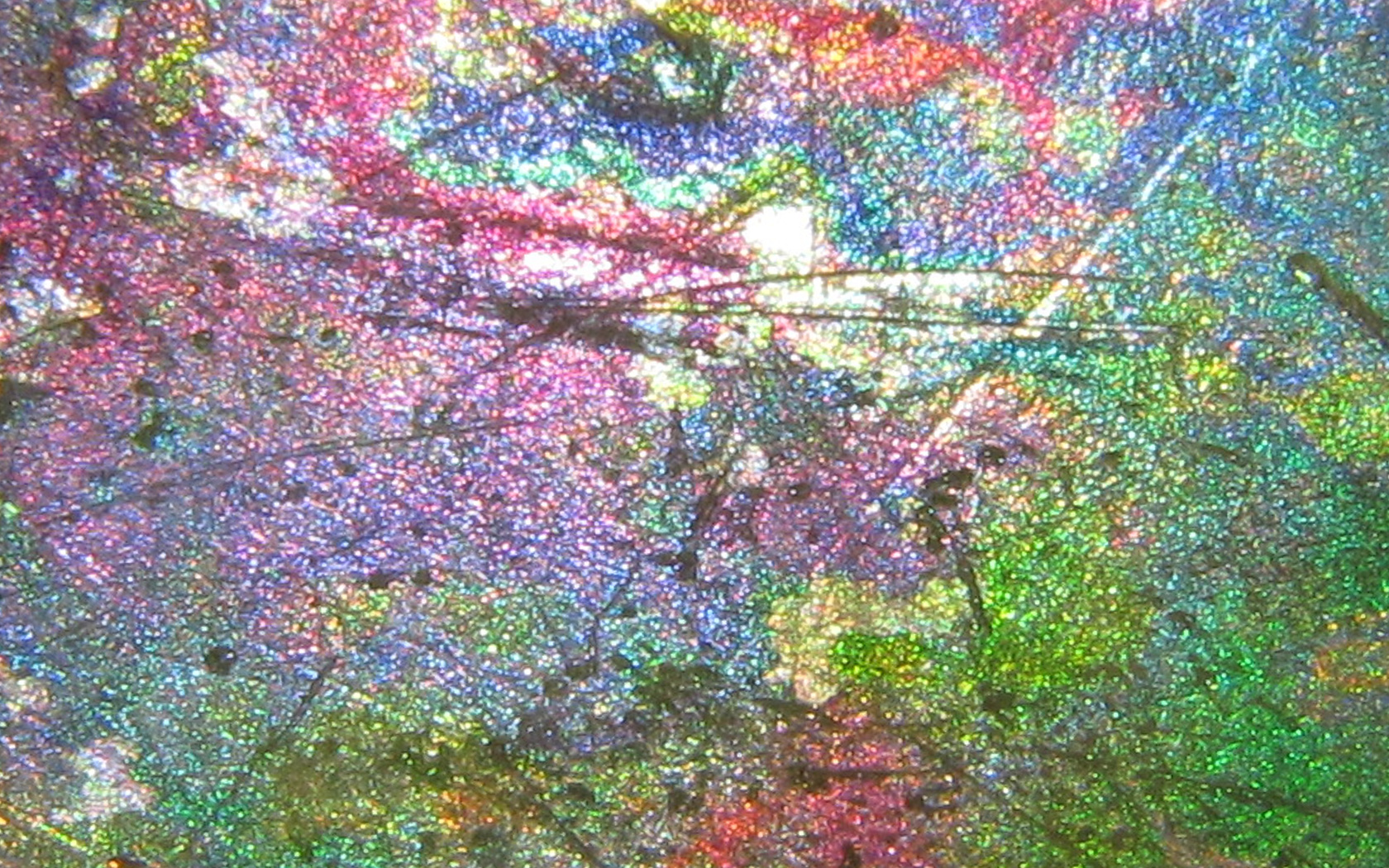 A rather abstract image for a desktop background, but this is a photograph of sunlight reflecting from the surface of a piece of old glass we dug up in the vegetable plot. The colours are a result of corrosion of the surface of the glass by water in the soil. It would be nice to know how old it is.