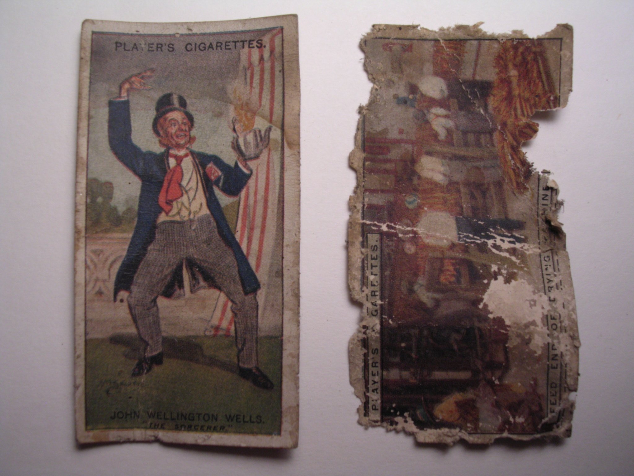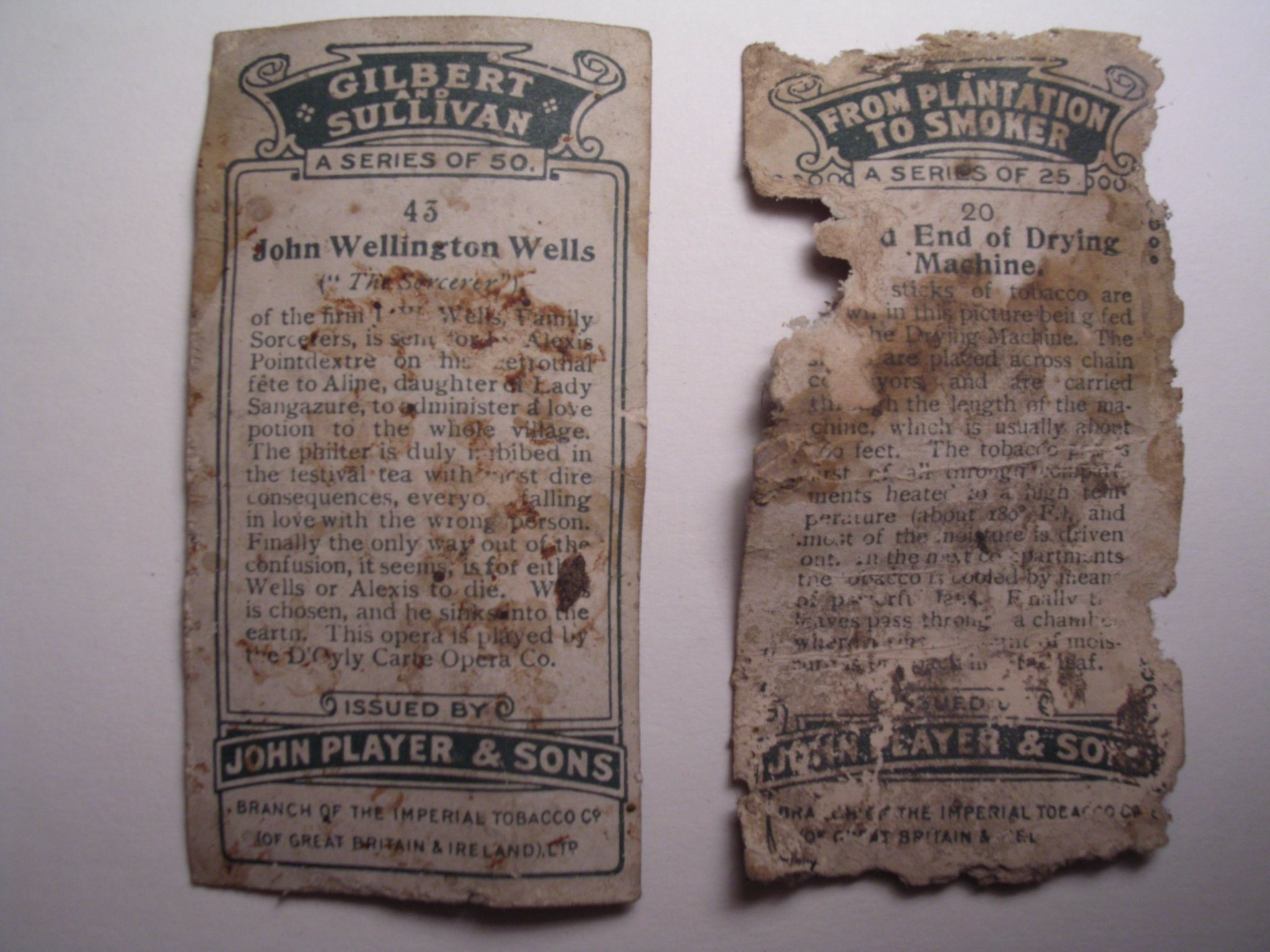 Maybe these cigarette cards were of a similar vintage to the pack? The reverse of the cards is here. A little research shows that the card depicting the Gilbert and Sullivan character John Wellington Wells was from a set issued in 1925, and that the "From Plantation To Smoker" set was issued in 1926.