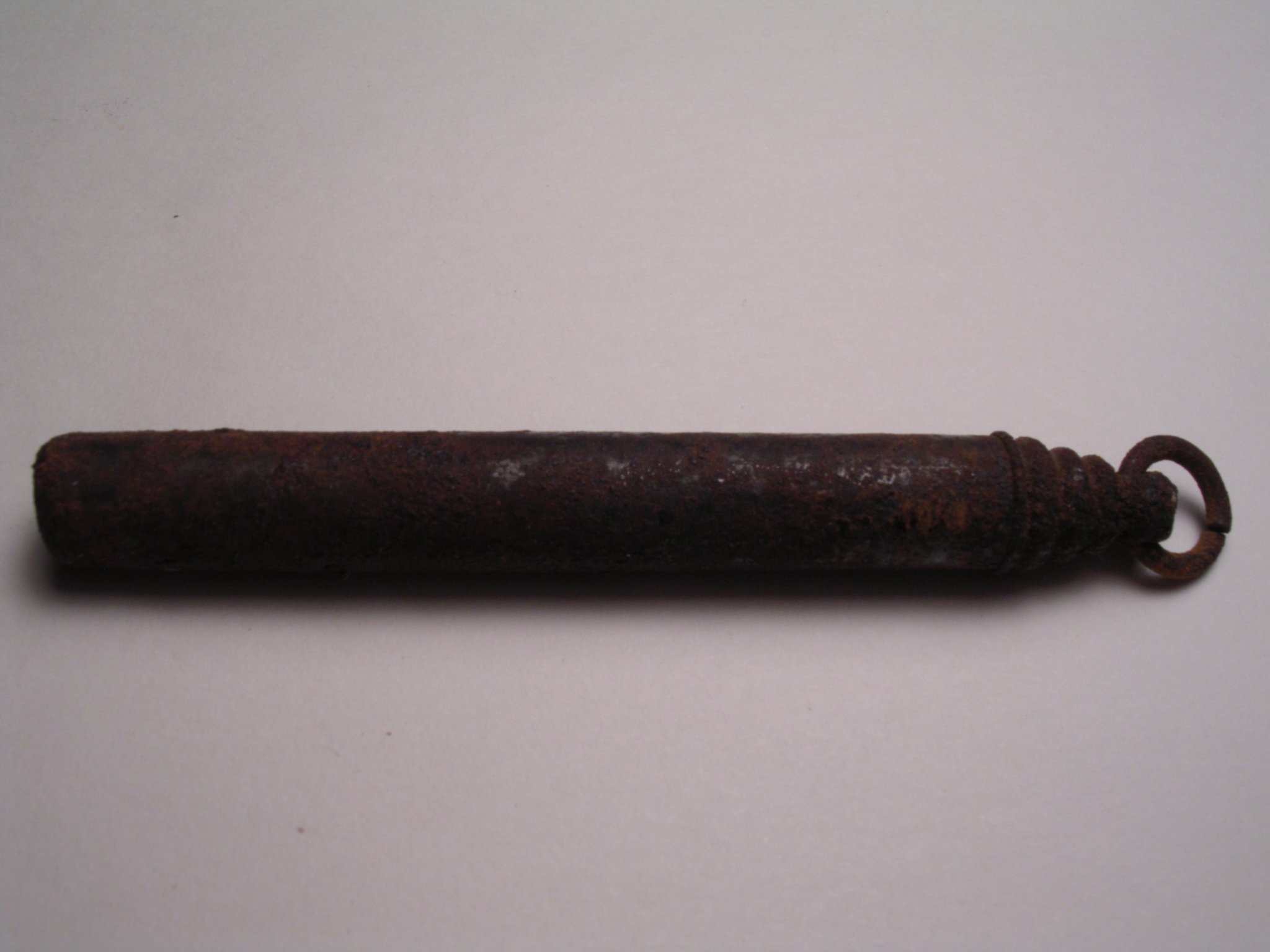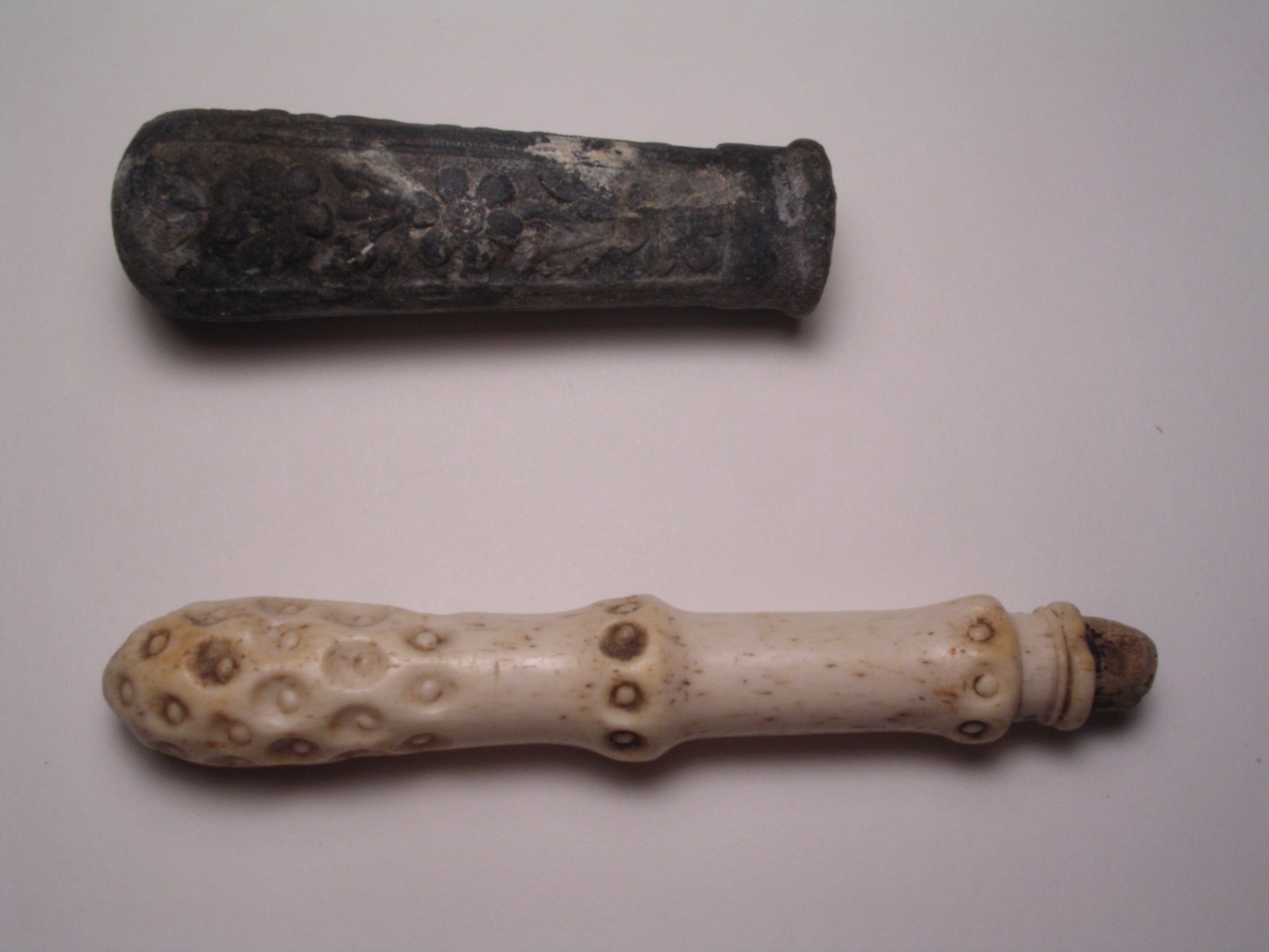 These weights (one made of bone, the other probably of cast zinc) both have remnants of wood fixed in the open end.