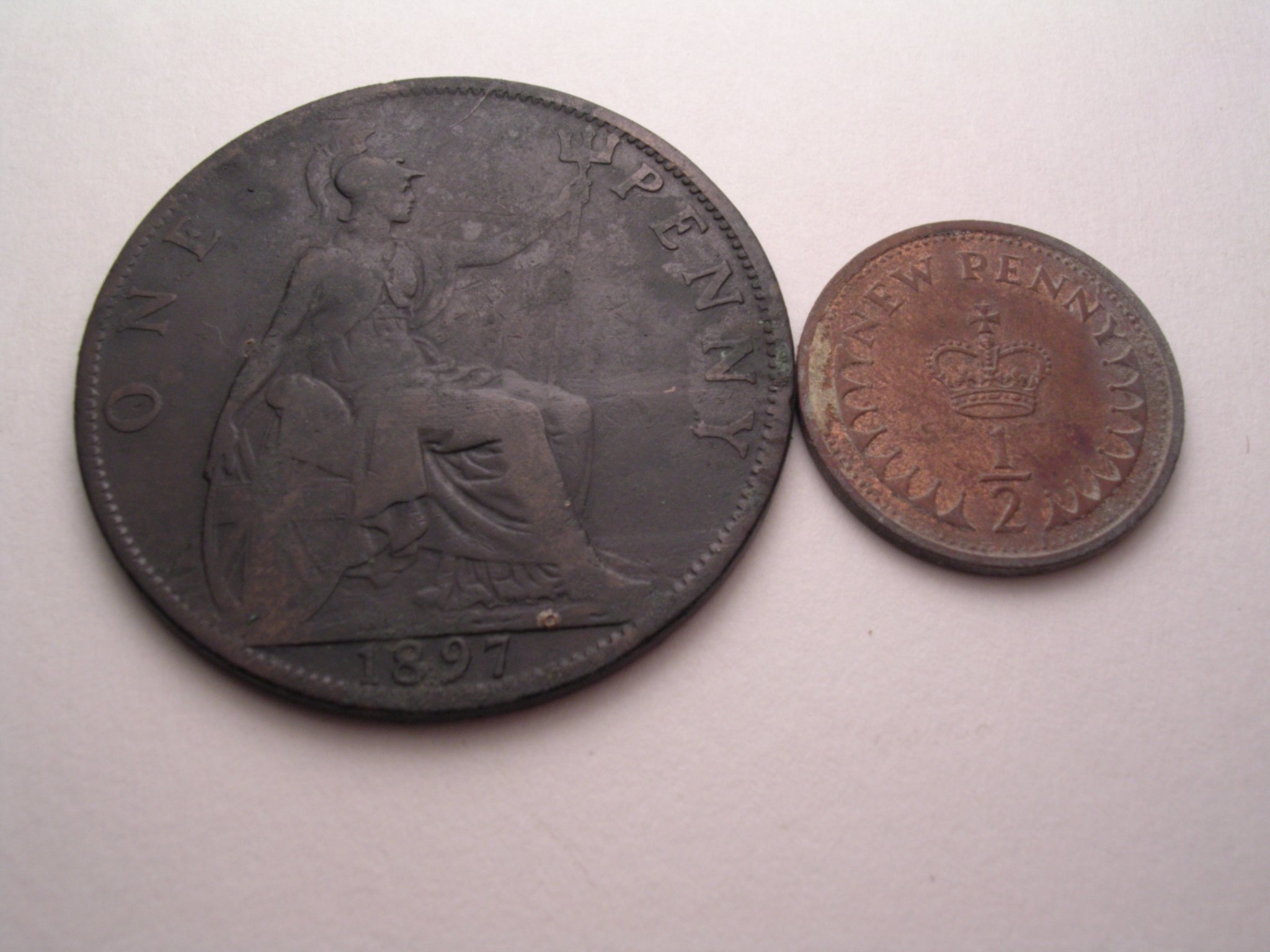 A penny, and a half new penny (photo) were found under floors upstairs. The UK changed from the old (pounds, shillings and pence) coinage to the new (100 new pence = one pound) in 1971.