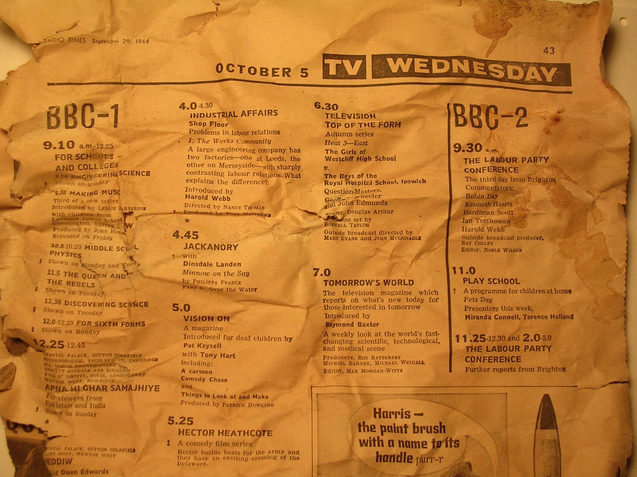 Other paper and card objects found include a page from an English grammar textbook ;this photograph card , though unfortunately the photograph was missing from the front of the card; and this page from the "Radio Times" showing BBC TV programmes on October 5th 1966.