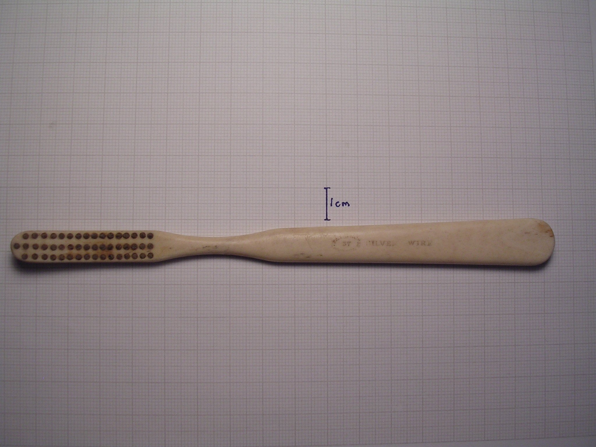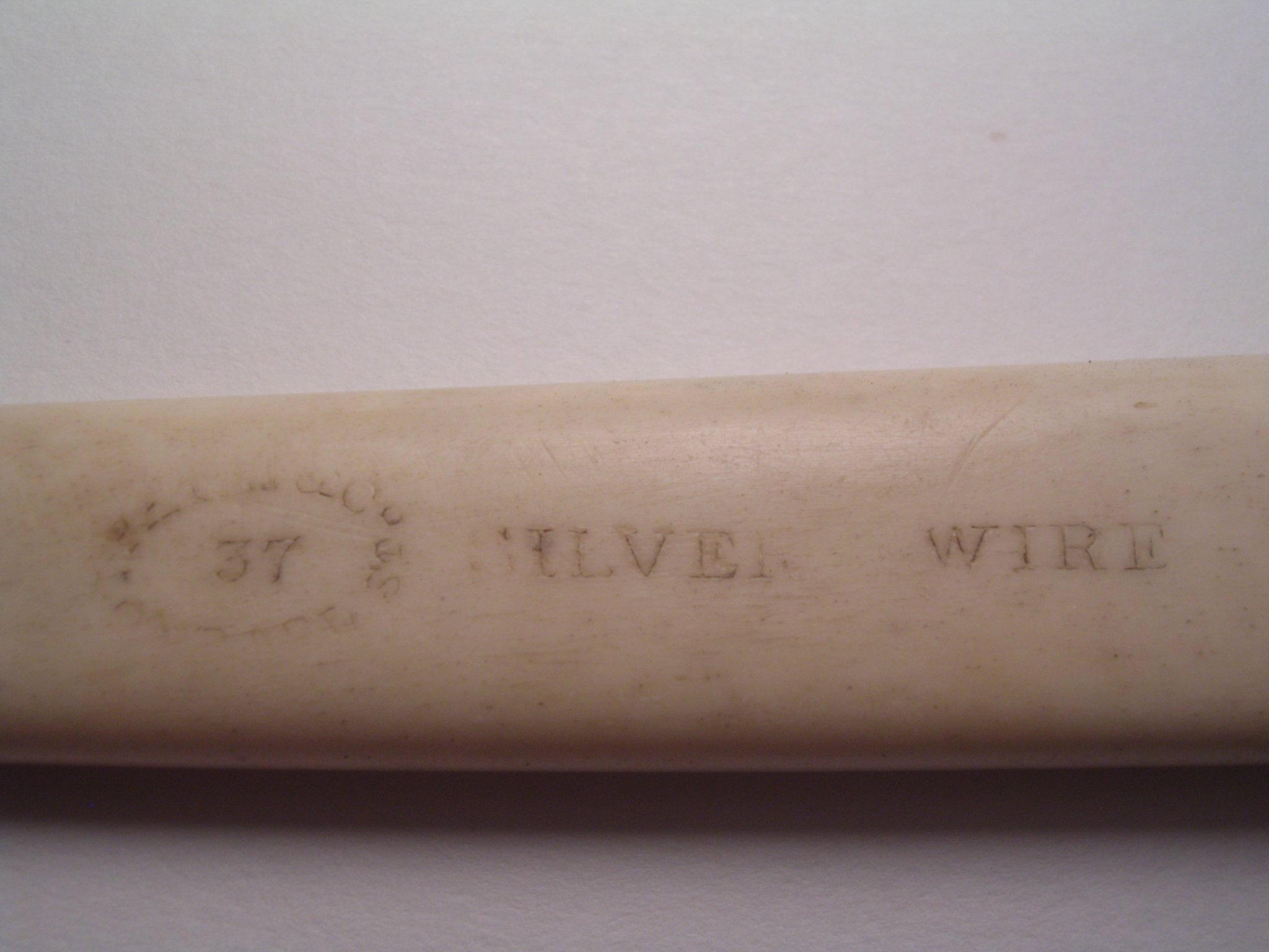 The marking on the handle has an unidentifiable manufacturer's mark, but also says "silver wire". This probably refers to the wire used to retain the bristles, which is still visible in the rear of the head of the brush.