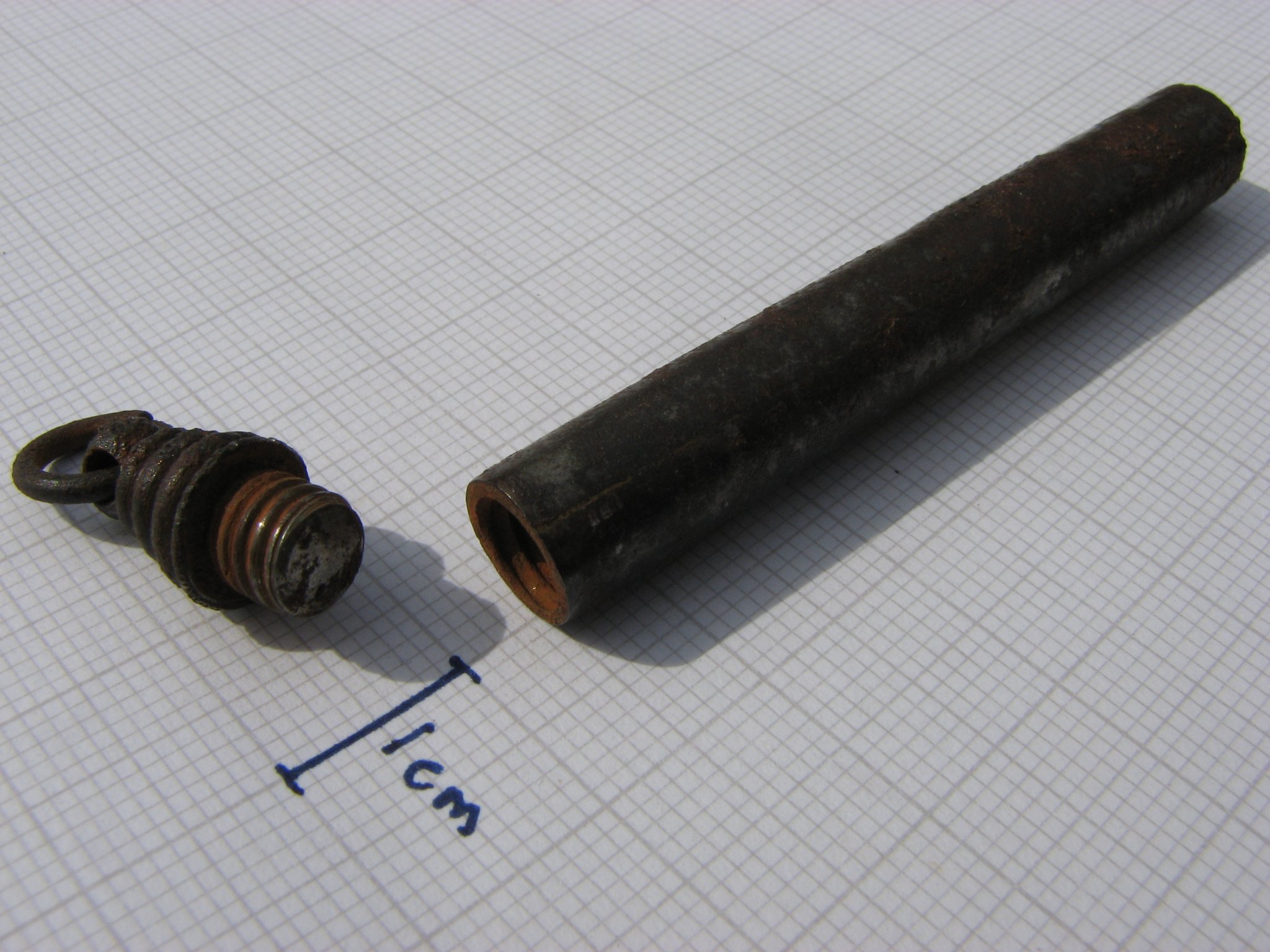 We wondered whether this might be a plum-bob, used when hanging wallpaper. It was included at the end of this page as a bit of a mystery, until Chris Jahn emailed us with some thoughts and questions. This prompted us to clean it up some more, which revealed that it was designed to open....